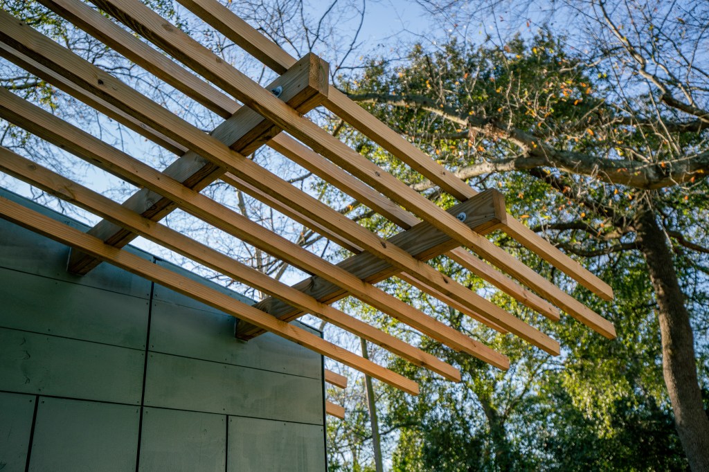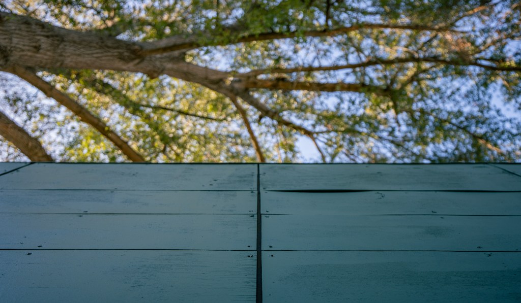 At its core, the studio embodies the biophilic principle of peril and refuge—the idea that nature is inherently unpredictable, and part of our connection to it is the balance between safety and risk. The towering trees above hold both beauty and danger; their presence is awe-inspiring, yet they shed limbs without warning. The trellis mediates this relationship, offering protection while keeping the raw power of nature in full view. Within the studio, one is always aware of the living system beyond its walls—the shifting shadows, the wind moving through branches, the filtered light that marks the passage of time.