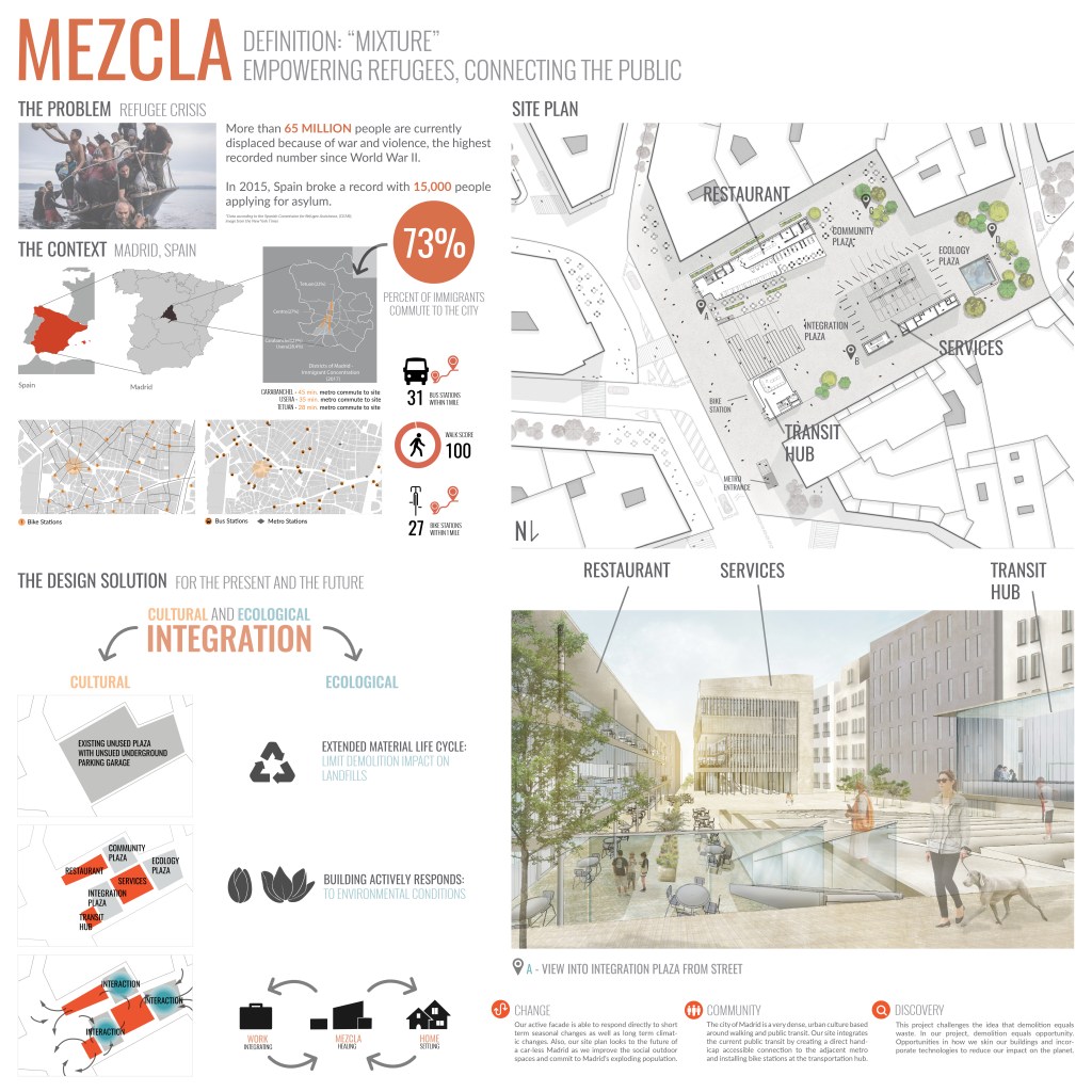 There is a humanitarian crisis in the middle east. People have been fleeing war to start a new life in Europe. This has created hostile tensions among most European citizens. The architectural response to this problem thus far is to isolate refugees from the rest of the European population. Camps, slums, and isolated neighborhoods are the current urban response to the problem. People are always sacred of what they cannot see and cannot relate. Though, Spain remains a very receptive culture to immigrants despite tensions elsewhere. They have had a long history with accepting asylum seekers from Africa and South America. Our project aims to create a Center for Integration in the heart of Madrid, among the population. A center of refuge in the most vibrant sector of Madrid, for those who need it most.