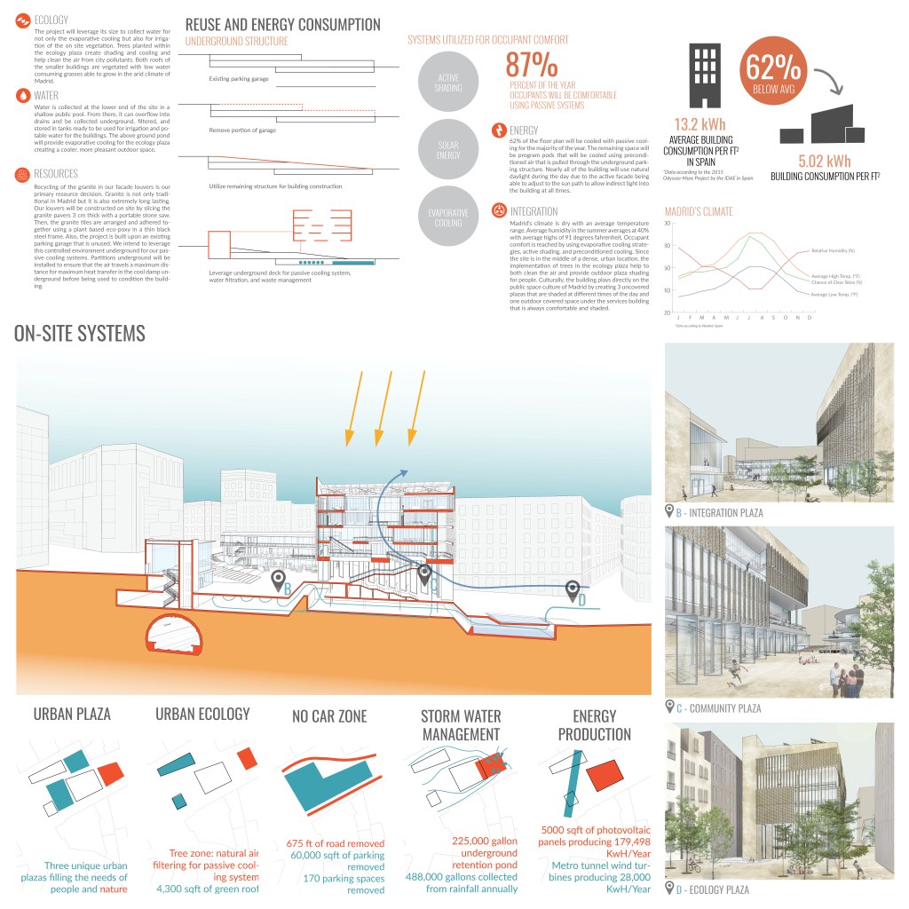 Madrid’s climate is dry with an average temperature range. Average humidity in the summer averages at 40% with average highs of 91 degrees fahrenheit. Occupant comfort is reached by using evaporative cooling strategies, active shading, and preconditioned cooling. Since the site is in the middle of a dense, urban location, the implementation of trees in the ecology plaza help to both clean the air and provide outdoor plaza shading for people. Culturally, the building plays directly on the public space culture of Madrid by creating 3 uncovered plazas that are shaded at different times of the day and one outdoor covered space under the services building that is always comfortable and shaded.