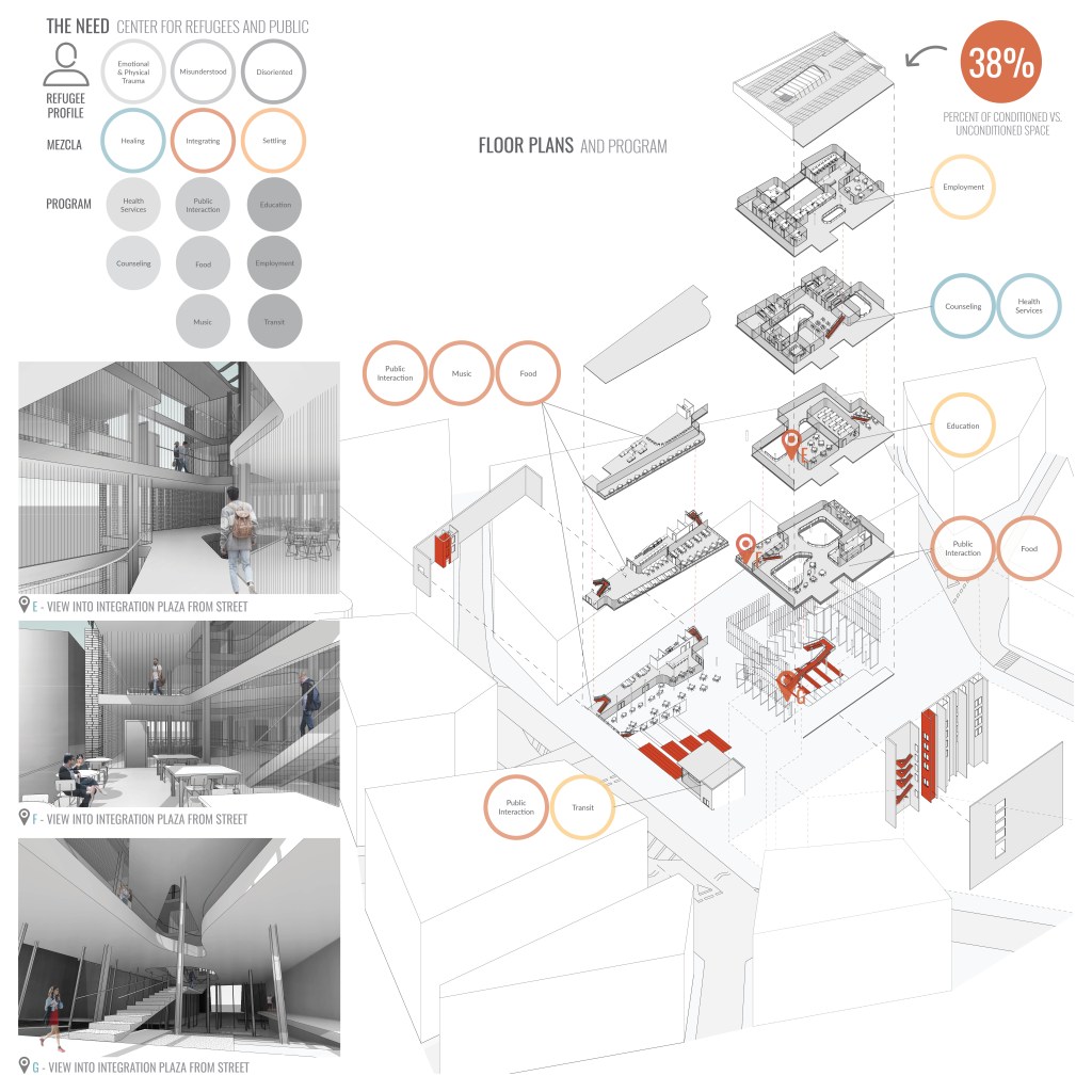 We have designed MEZCLA (spanish for “Mixture”), a space to empower the refugees and connect them to the public. The typical refugee is misunderstood, has endured emotional and physical trauma, and is disoriented upon arrival in a foreign country. As a direct response to each of these issues, our project aims to HEAL, INTEGRATE, and SETTLE these refugees.