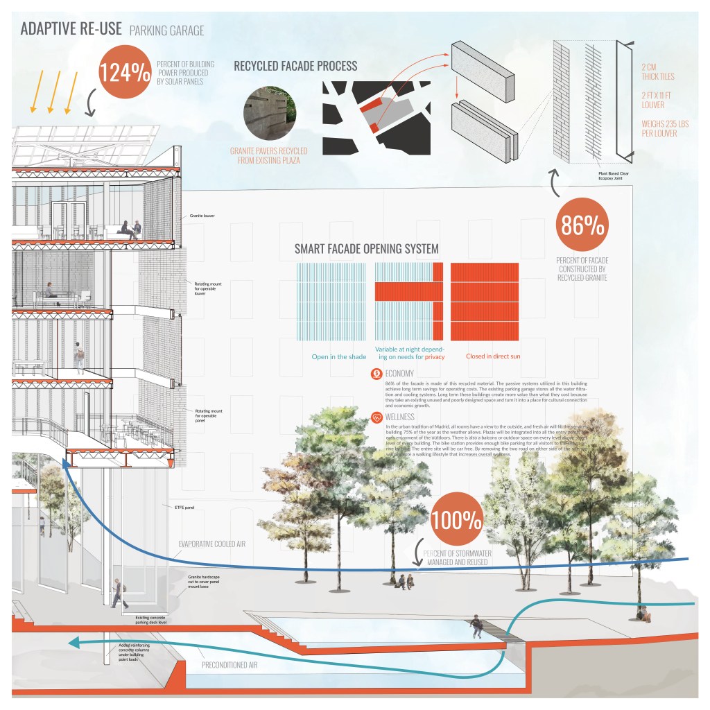 Recycling of the granite in our facade louvers is our primary resource decision. Granite is not only traditional in Madrid but it is also extremely long lasting. Our louvers will be constructed on site by slicing the granite pavers 3 cm thick with a portable stone saw. Then, the granite tiles are arranged and adhered together using a plant based eco-poxy in a thin black steel frame. Also, the project is built upon an existing parking garage that is unused. We intend to leverage this controlled environment underground for our passive cooling systems. Partitions underground will be installed to ensure that the air travels a maximum distance for maximum heat transfer in the cool damp underground before being used to condition the building.